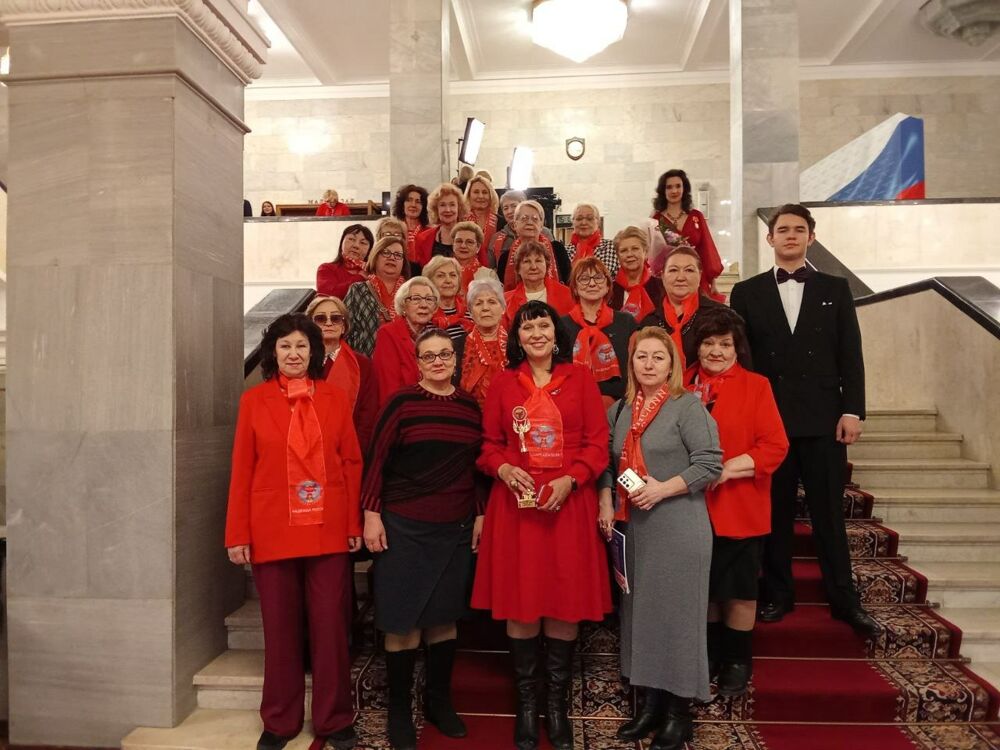Малый зал, где проходила встреча, оказался полностью заполнен. В этот день он окрасился в красные тона – подавляющее большинство активисток движения были в нарядных красных платьях и костюмах. Абсолютно всех украшал красный шарфик с символикой «ВЖС». При входе каждой участнице был вручён новый выпуск журнала «Надежда РУ».