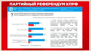 Но при этом, как отметил Сергей Обухов, в исследованиях кластерный анализ показывает, что осведомленность ключевых для роста поддержки КПРФ электоральных групп в программных вопросах, вопросах «Народного референдума» явно не достаточна. КПРФ предстоит усилить работу с женским электоратом, молодёжью, трудящимися наиболее работоспособных возрастов 35-55 лет.