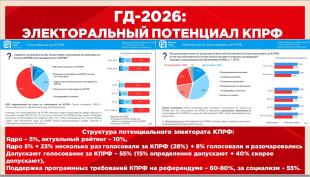 «Поддержка наших программных требований – от 60 до 80 процентов по данным опросам центра «Русское поле» (Russian Field). За национализацию ресурсо-снабжающих организаций в ЖКХ выступают более 60%, за льготы детям войны – 79%, за ограничение торговых наценок в торговых сетях – 78%, за возвращение советского пенсионного возраста – 87%. При этом за социализм – 55% избирателей, готовы при определенных условиях голосовать за КПРФ – тоже 55%. Вместе с ядром несколько раз голосовавших за КПРФ – 28% плюс 8% голосовавших, но разочаровавшихся. Это показывает высокий потенциал программных идей КПРФ. Но одновременно (при нынешнем официальном рейтинге в 10%) указывает на коммуникативную проблему – недостаточную вовлечённость и осведомленность избирателей».