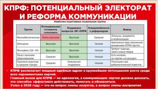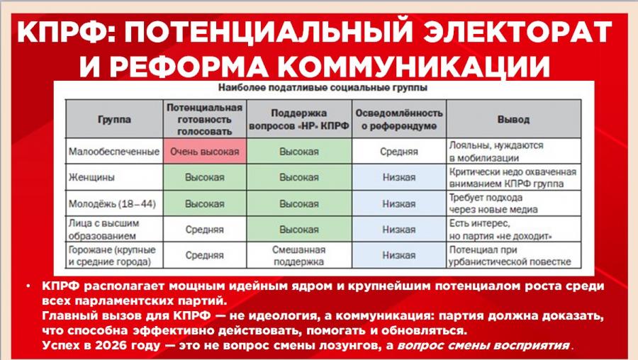 «Перед КПРФ не стоит вопрос смены лозунгов, а вопрос смены восприятия. Нам необходимо усилить коммуникацию с конкретными социальными группами, допускающими наибольшую готовность голосовать за КПРФ».