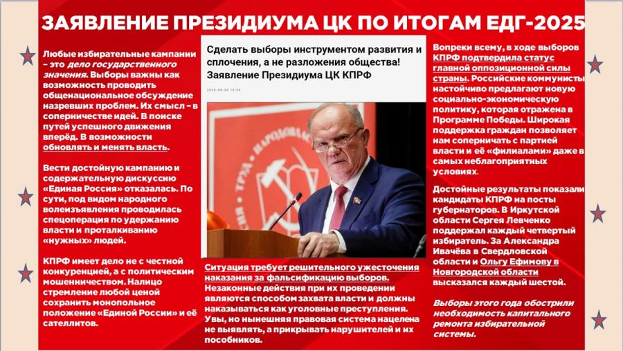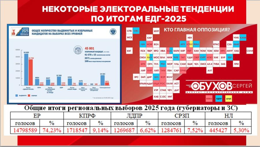 Комментируя общие итоги избирательной кампании, депутат-коммунист Сергей Обухов обратил внимание на заявление Президиума ЦК КПРФ по итогам ЕДГ-2025.