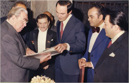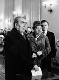 Визит в СССР короля Испании Хуана Карлоса Первого и и королевы Софии. 1984 Весна 1984 года. Торжественная встреча и проводы в аэропорту короля Хуана Карлоса I и королевы Софии. Встреча и переговоры в Кремле. Присутствуют: К. У. Черненко, Н. А. Тихонов, А. А. Громыко, министр иностранных дел Испании Моран и другие официальные лица СССР и Испании.