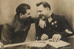 Вручение ордена "Победа" СталинуКалинин вручает Маршалу Сталину высший военный орден Советского Союза "Победа", - за исключительные заслуги в организации проведения наступательных операций Красной армии приведших к крупнейшему поражению германской армии и к коренному изменению положения на фронте борьбы с немецко-фашистскими захватчиками в пользу Красной армии. Одновременно Маршалу Советского Союза Сталину за выслугу лет в Красной армии вручен орден "Красного знамени".
