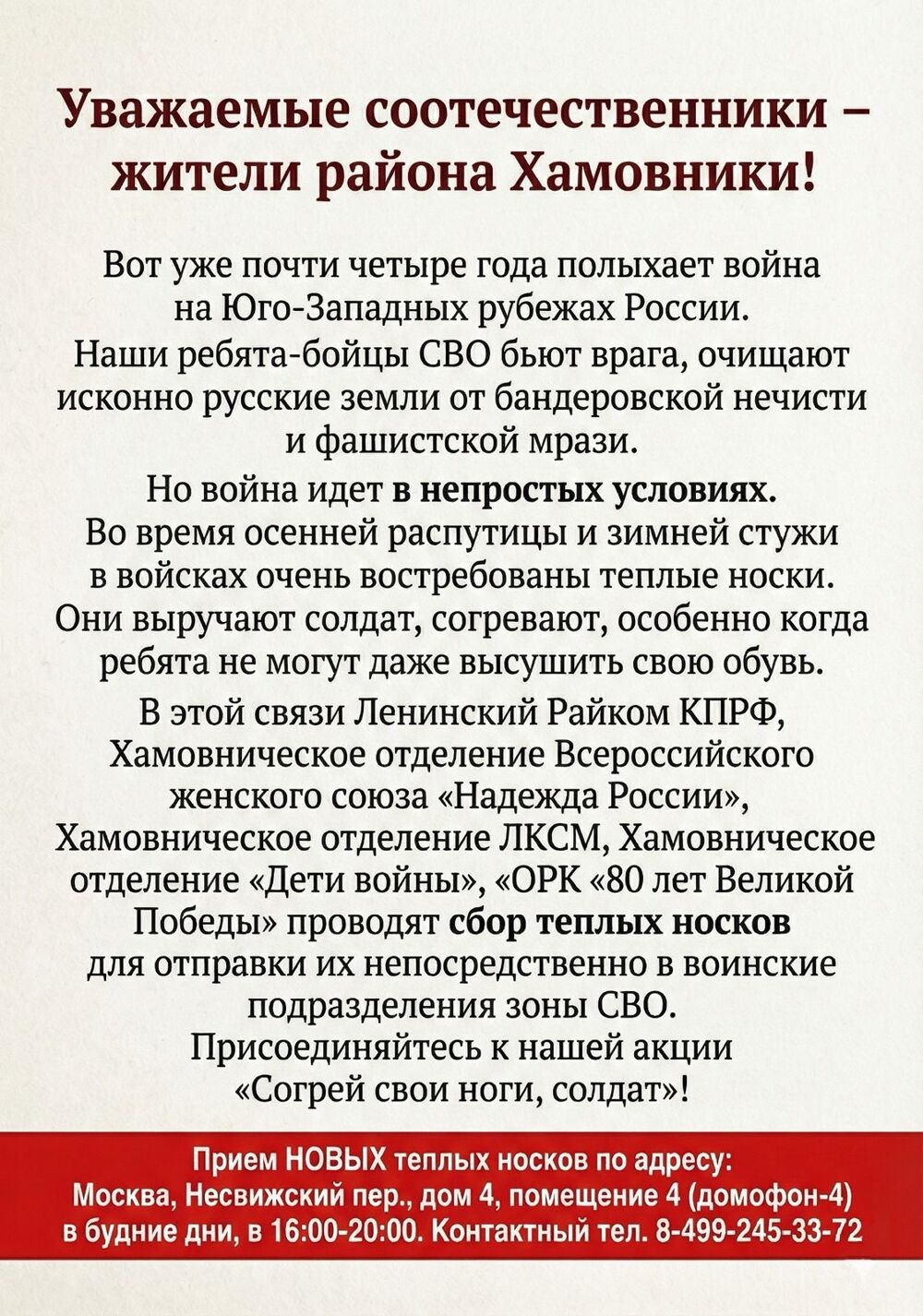 В этой связи Ленинский Райком КПРФ, Хамовническое отделение Всероссийского женского союза "Надежда России", Хамовническое отделение ЛКСМ, Хамовническое отделение “Дети войны”, ”ОРК "80 лет Великой Победы", проводят сбор теплых носков для отправки их непосредственно в воинские подразделения зоны СВО.