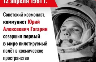 Дата в истории. 12 апреля 1961 г. советский космонавт, коммунист Ю.А. Гагарин совершил первый в мире пилотируемый полёт в космическое пространство